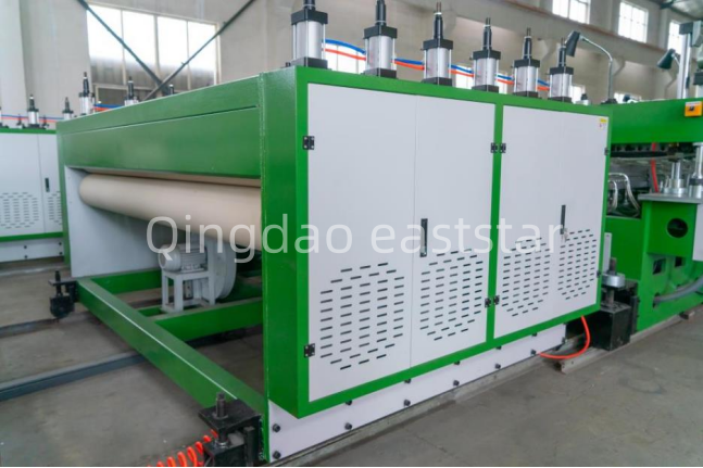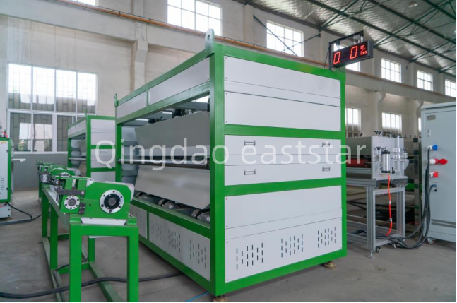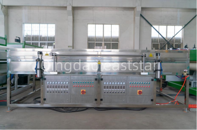ЦелиотОпрема за панели со отворени ќелии од PPисто така вклучува ахидрауличен менувач на екран со две станици, Апечка за израмнување, и амоќенуред за воздушно ладење. Првата влечна машина е опремена со 6 пара од 12 гумени валјаци, секој со големина на површината на валјакот од 250x2300 mm, управувани од мотор од 7,5 KW. Рерната за израмнување има опсег на контрола на температурата од 40℃-150℃, поделена во 16 зони за да се обезбеди плошноста на штиците. НаПП линија за производство на шупливи плочие опремен и со машина за попречно сечење и платформа за редење за да се постигне автоматско производство.