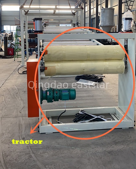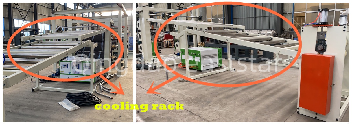 Го опремивмеАБС повеќеслојна линија за производство на листови со ко-екструзијасо комплетен систем за напојување и помошен систем. Екструдерот SJ-130 е опремен со фидер за завртки од нерѓосувачки челик E-1000, а екструдерот SJ-70 е опремен со вакуумски фидер E-300, обезбедувајќи прецизно снабдување со различни суровини. Поддршката за ладење е опремена со ролери од не'рѓосувачки челик долги 8 метри и три прилагодливи секачи на рабовите, што обезбедува доволно ладење на лимот и уредните рабови. Машината за сечење користи механичко електрично стрижење, опремено со корејски енкодер Autonics, за да постигне автоматско сечење со фиксна должина.