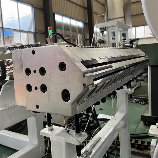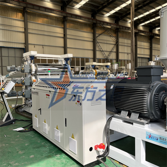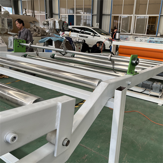 Опрема ПВЦ антистатичка плоча: Опремата главно се состои од екструдер со 120 единечни завртки, калндер со три валјаци, држач за ладење, машина за влечење со гумени ролери, машина за стрижење и уред со подвижна лента. Стандардната ширина на производот за опрема за задна плоча од ПВЦ желка е 1000 mm. Дебелината е 6 мм. Опремата со ПВЦ антистатичка плочка за екструдер може да произведе различни текстури како што се шаблонот на желка, шарата на кора од портокал и карираната шема. Опремата за ПВЦ желка може да се обработи и прилагоди според барањата на клиентите.