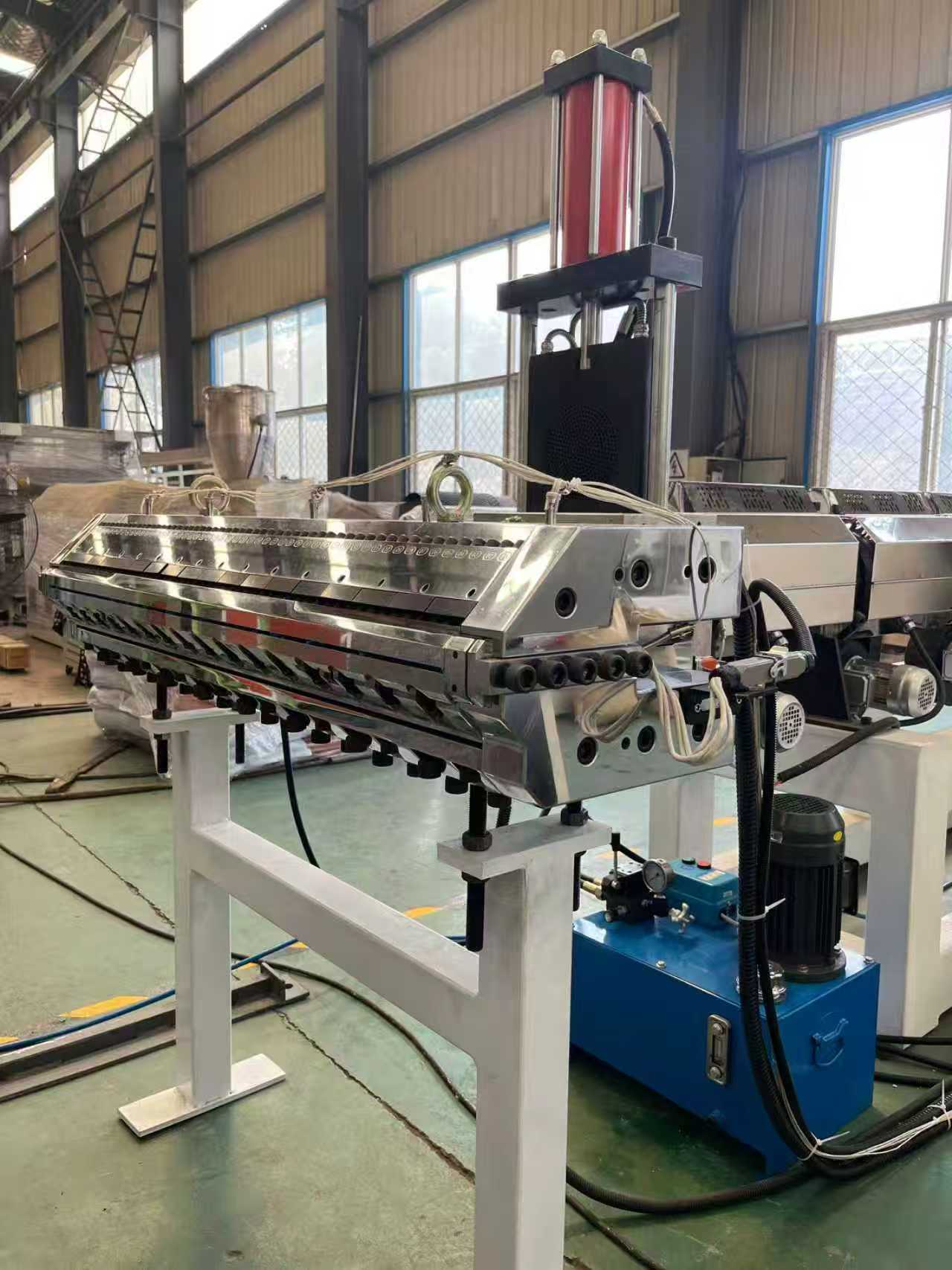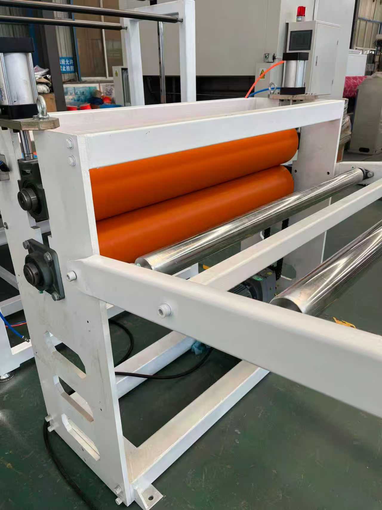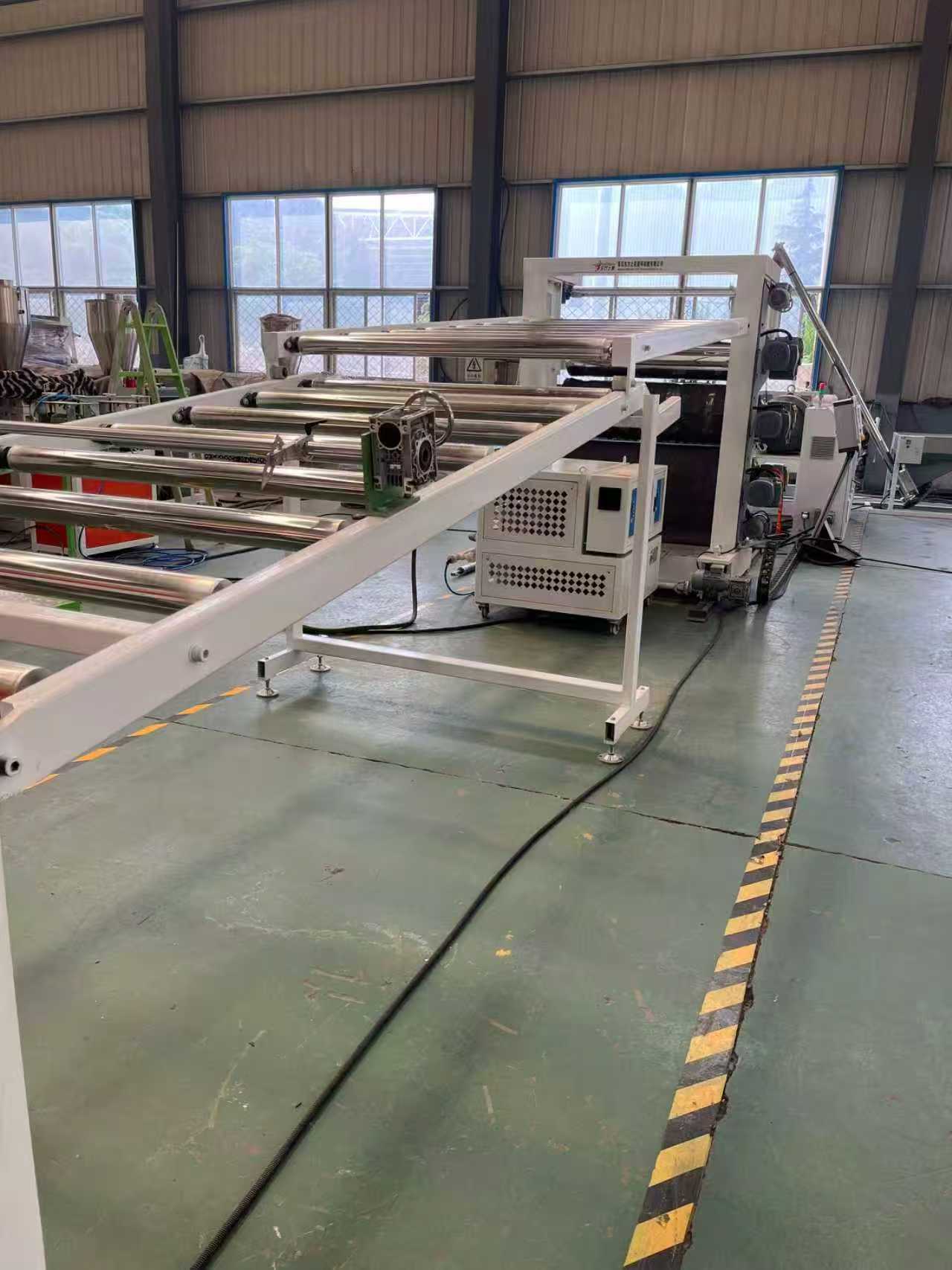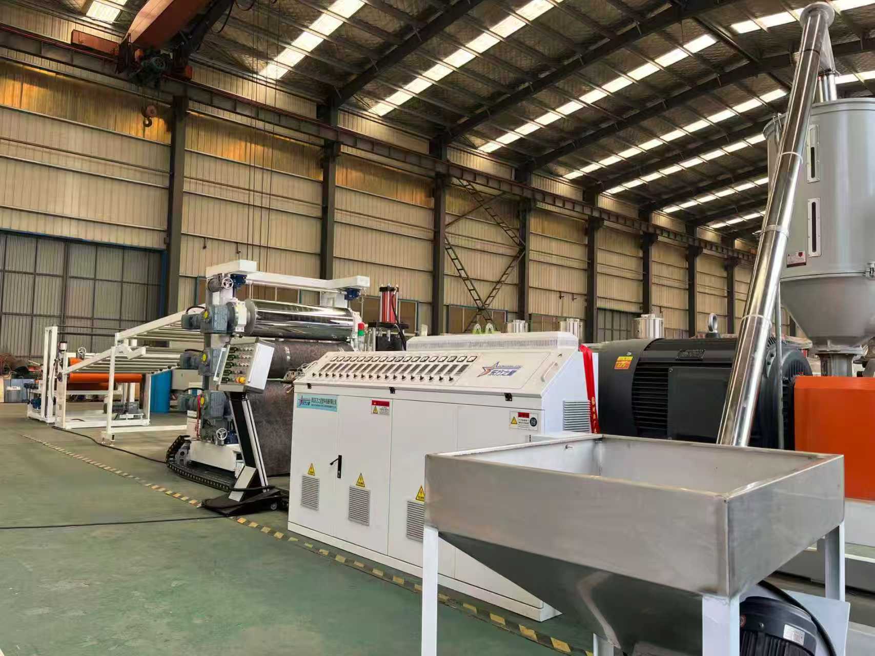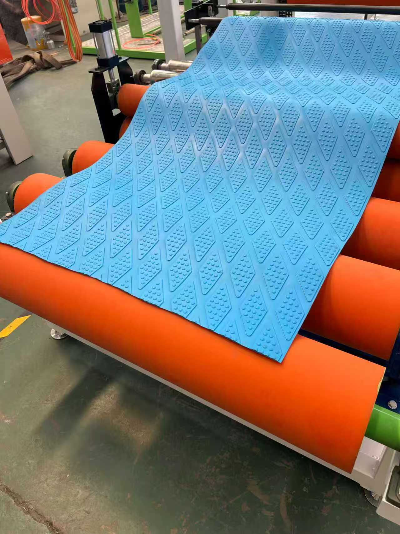ТПЕ-1000мм опрема за заштита од лизгање патосници за автомобил: Опремата главно се состои од екструдер со еден шраф, калндер со три валјаци, 6-метарски држач за ладење, машина за влечење со гумени ролери, машина за стрижење и уред со подвижна лента.